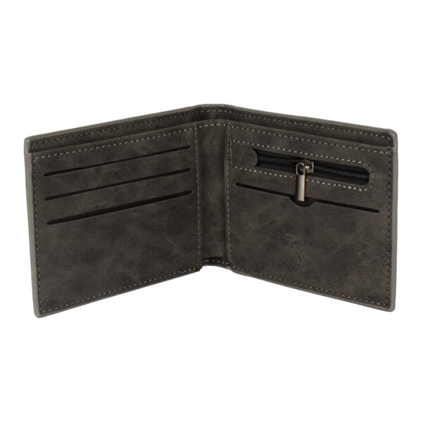 Billetera de eco-cuero, modelo «GEORGIA». Contiene 6 compartimentos interiores, uno de ellos con cremallera. Presentación en bolsa frozen y caja de cartón forrado negro opaco.